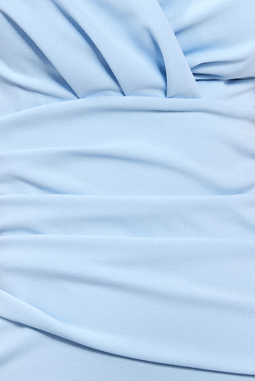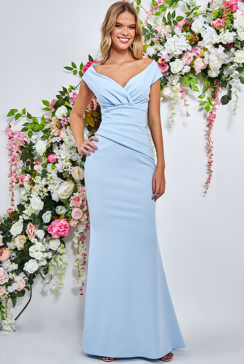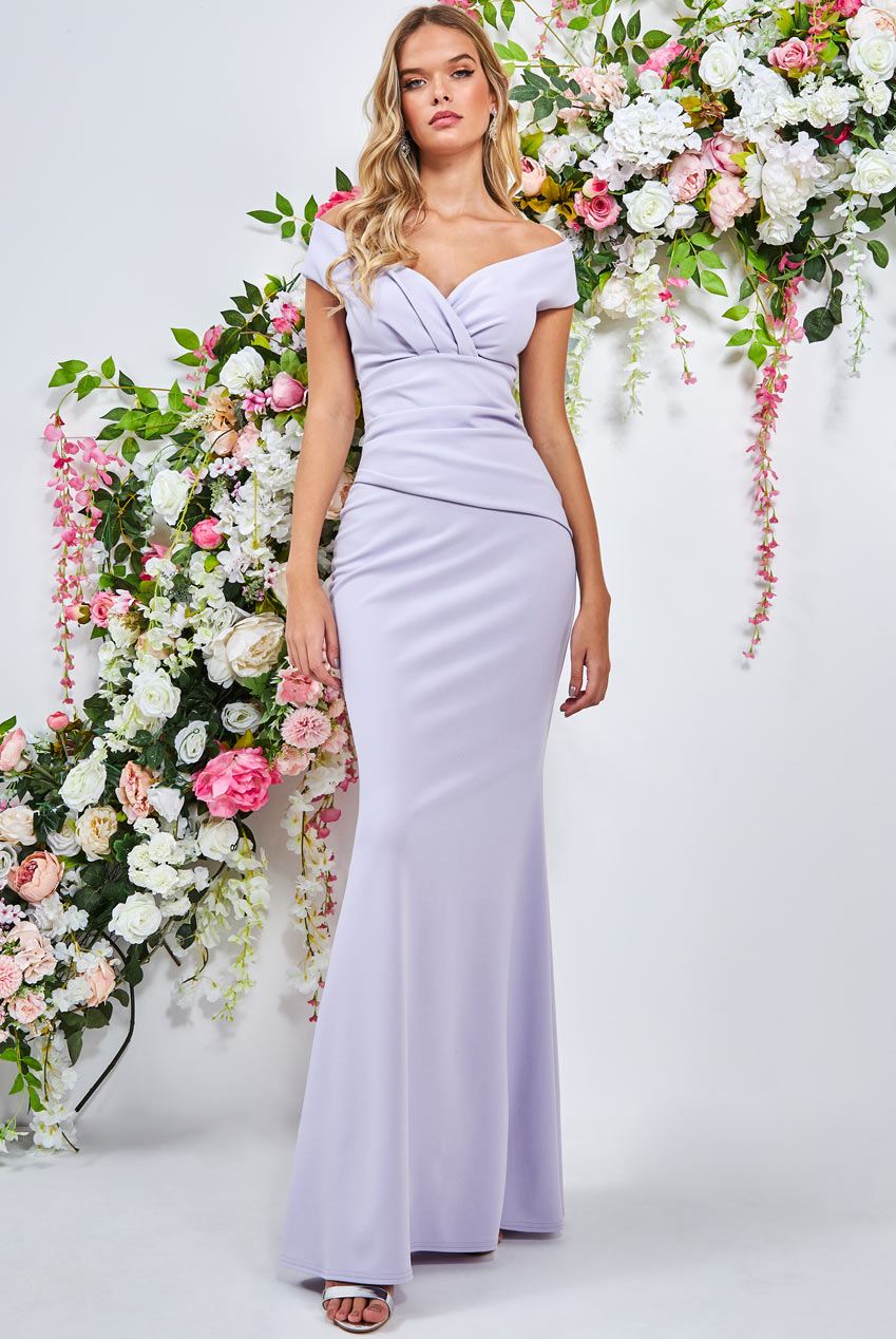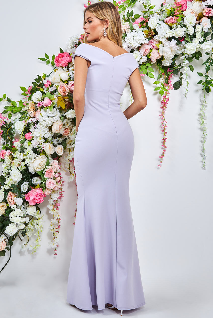 This stunning maxi dress features a chic Bardot neckline that beautifully frames the shoulders, adding a touch of sophistication to any occasion. The dress is adorned with delicate pleating details that flow gracefully from top to bottom, enhancing the overall silhouette. A concealed zip fastener at the back ensures a seamless fit, making this dress a perfect choice for both formal events and evening outings.