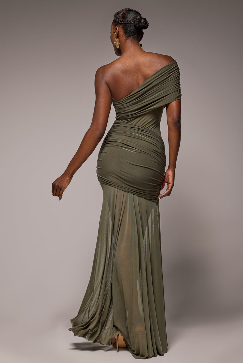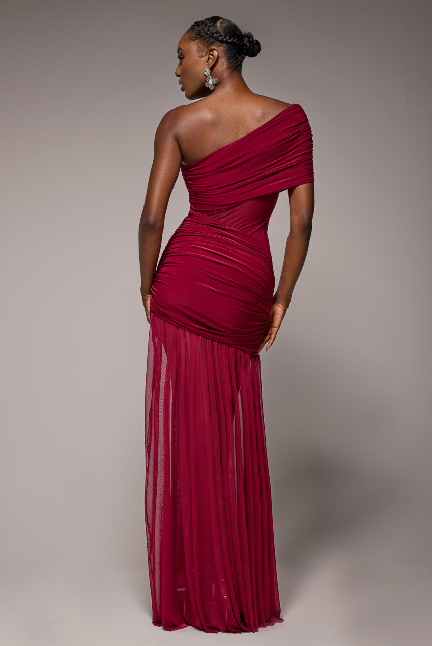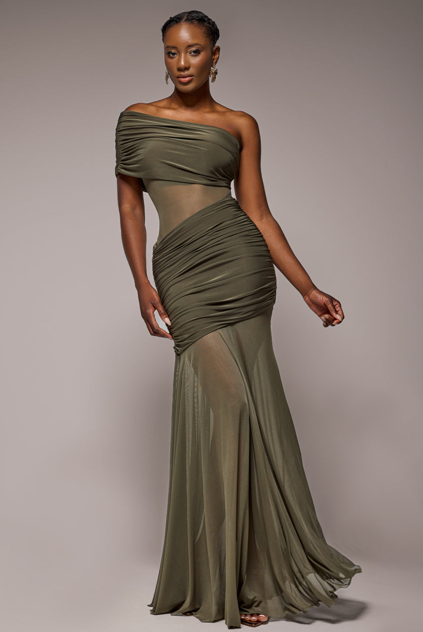 Goddiva Gathered One Shoulder Sheer Panel Maxi Dress