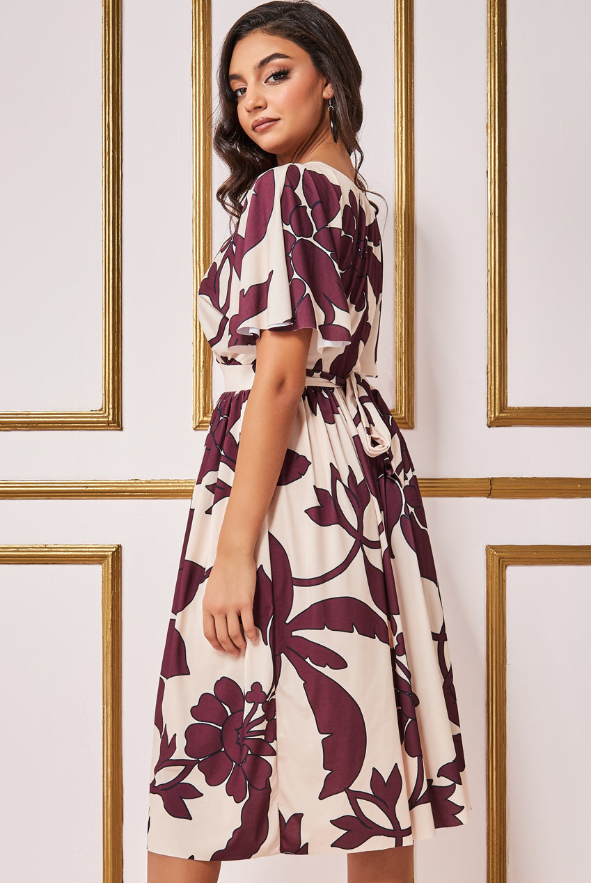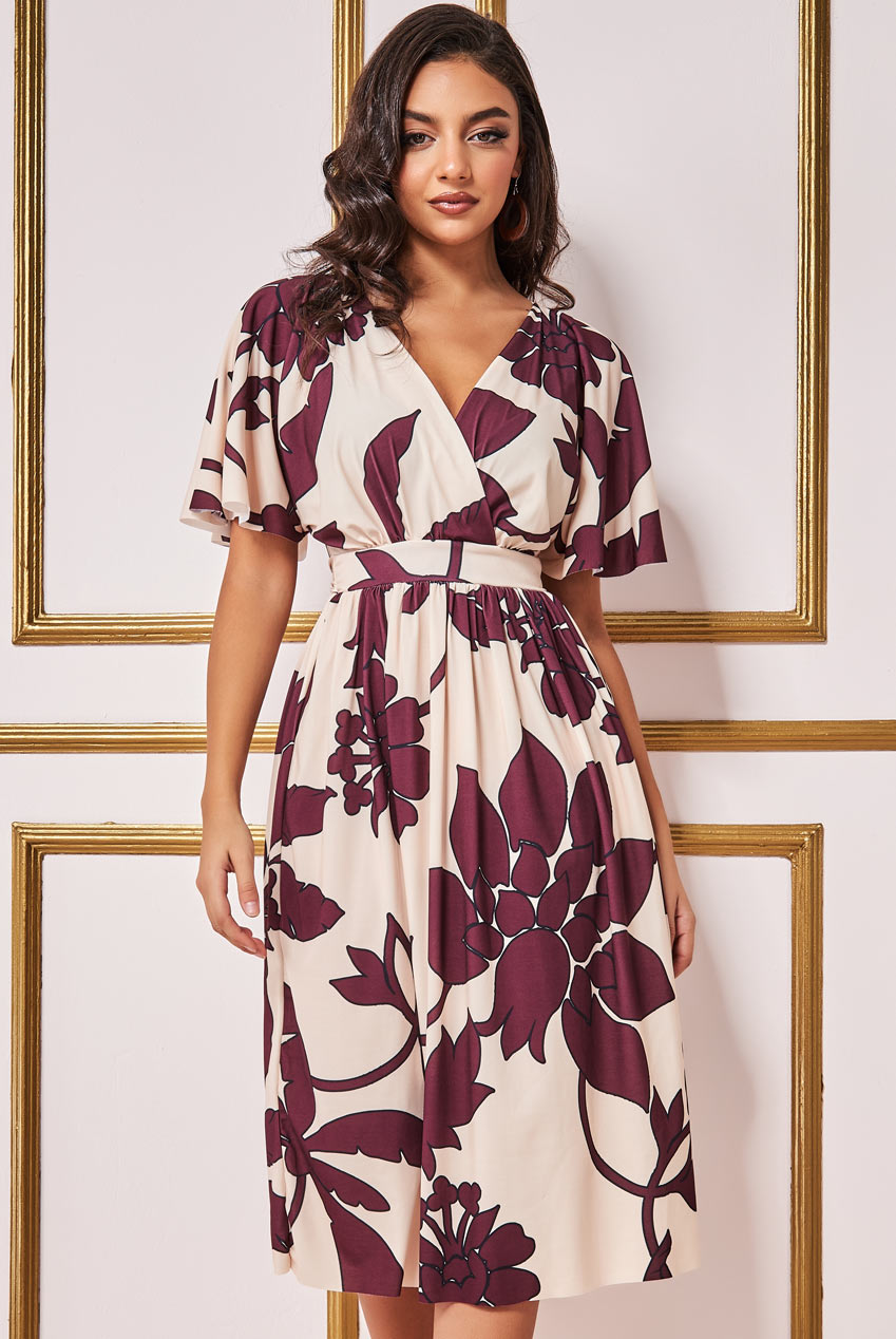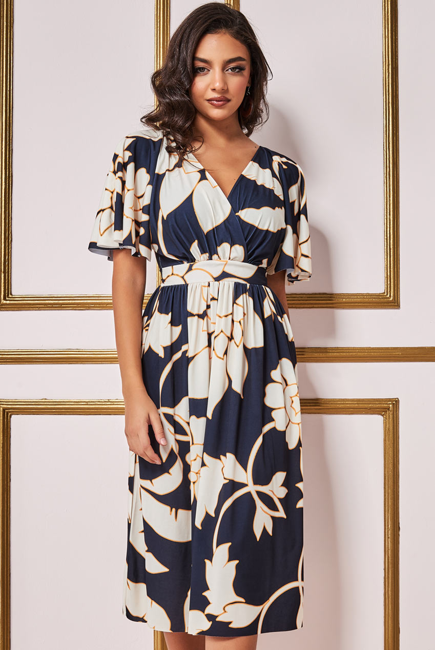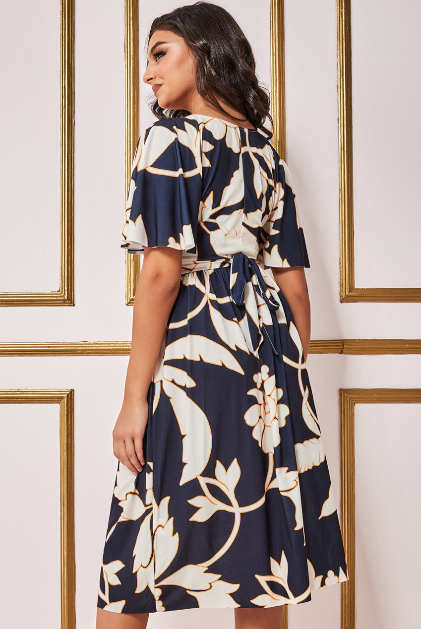 Goddiva Leaf Print Flutter Sleeve Midi Dress