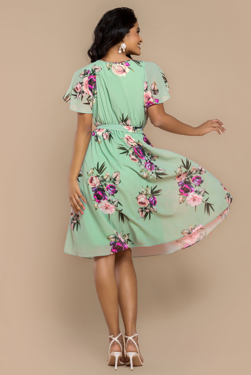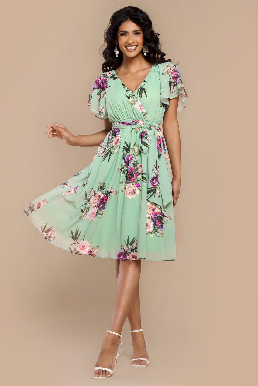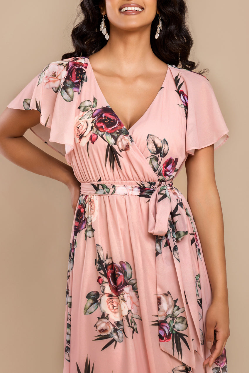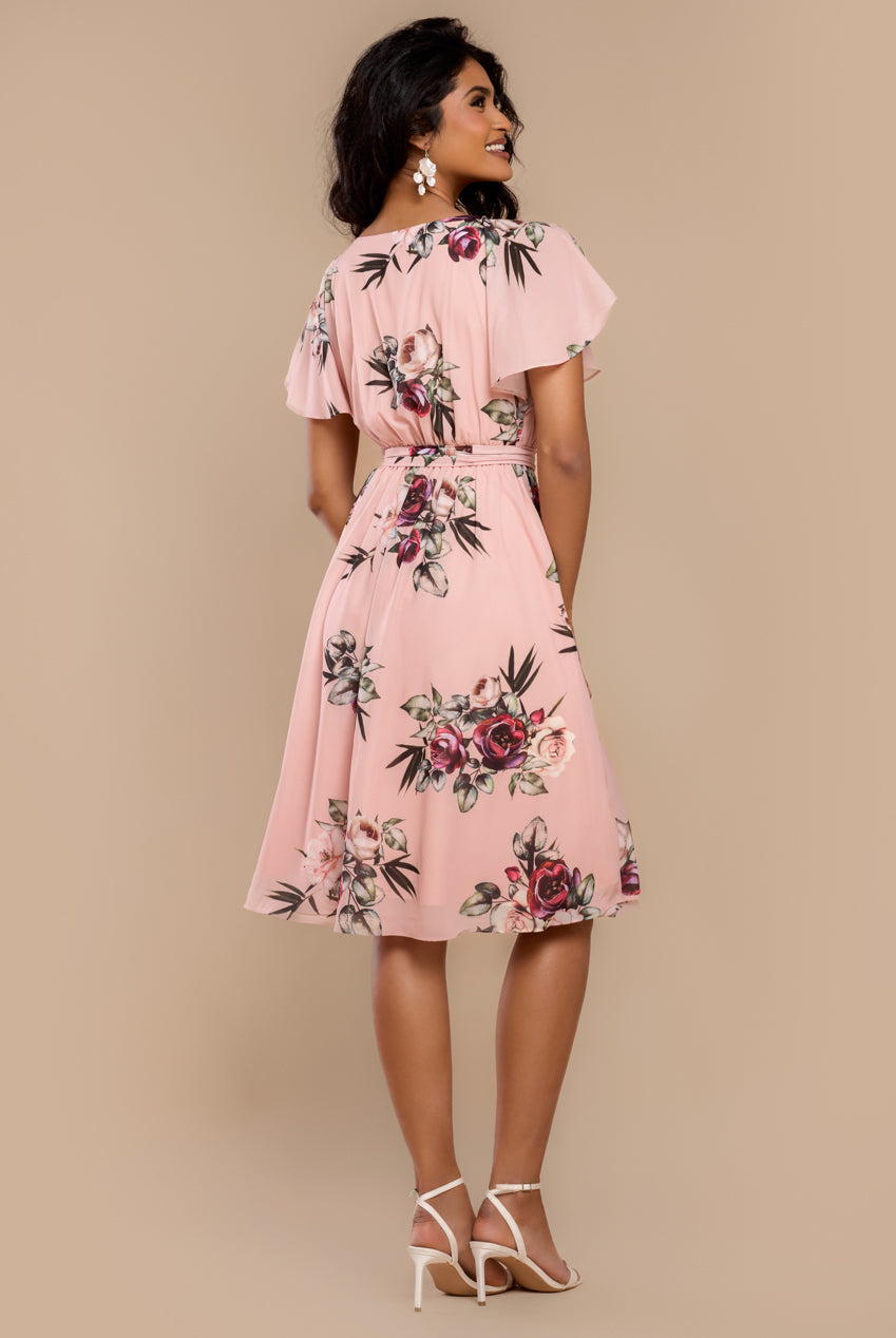 Goddiva Sustainable Floral Print Midi Wrap Dress With Flutter Sleeves