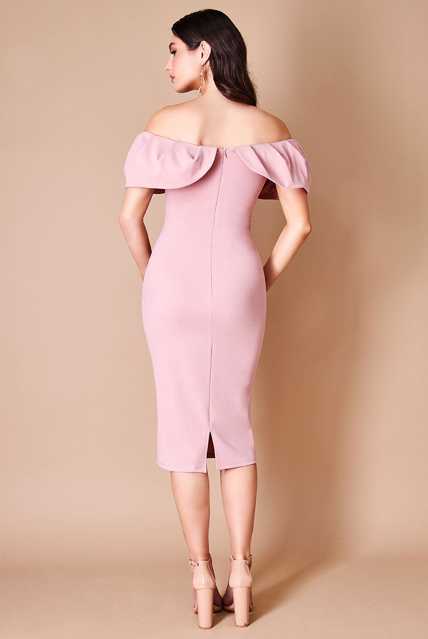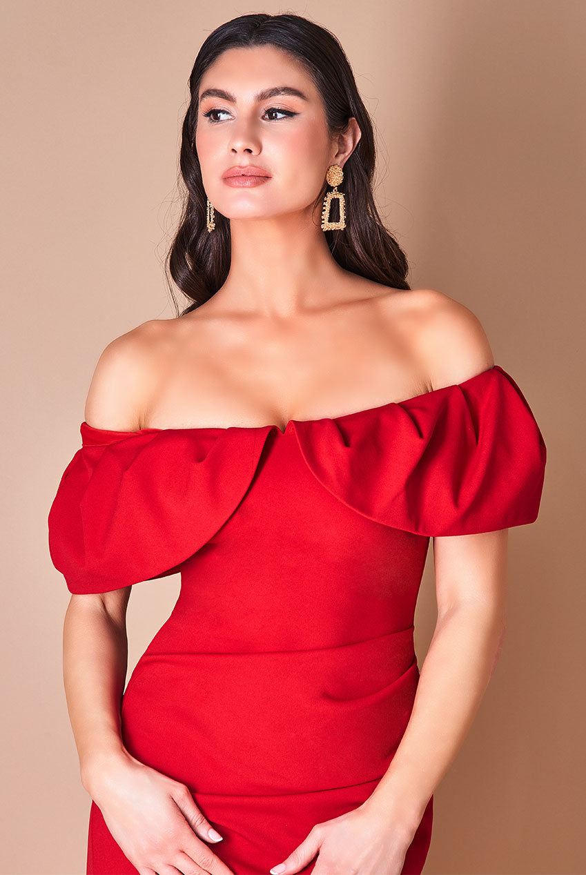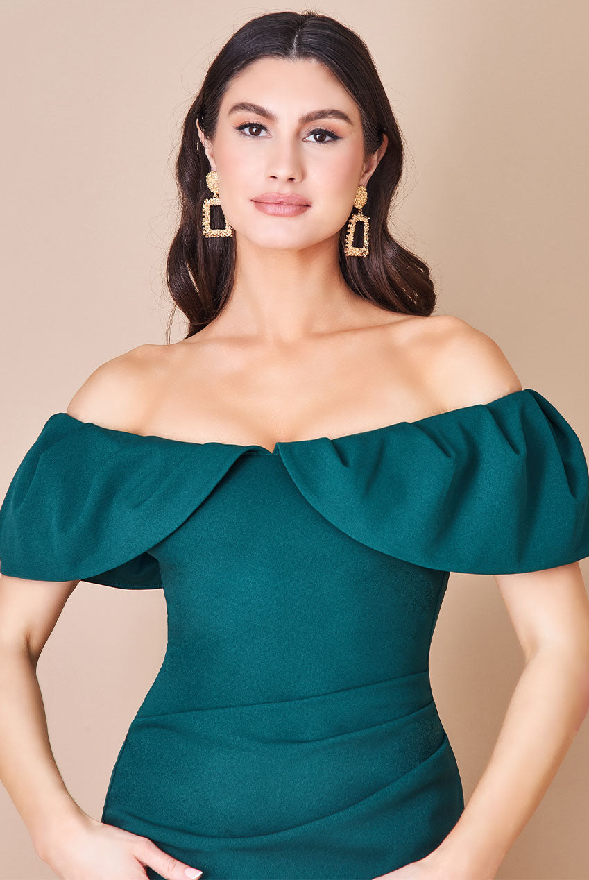 Goddiva Scuba Crepe Pleated Bardot Midi Dress