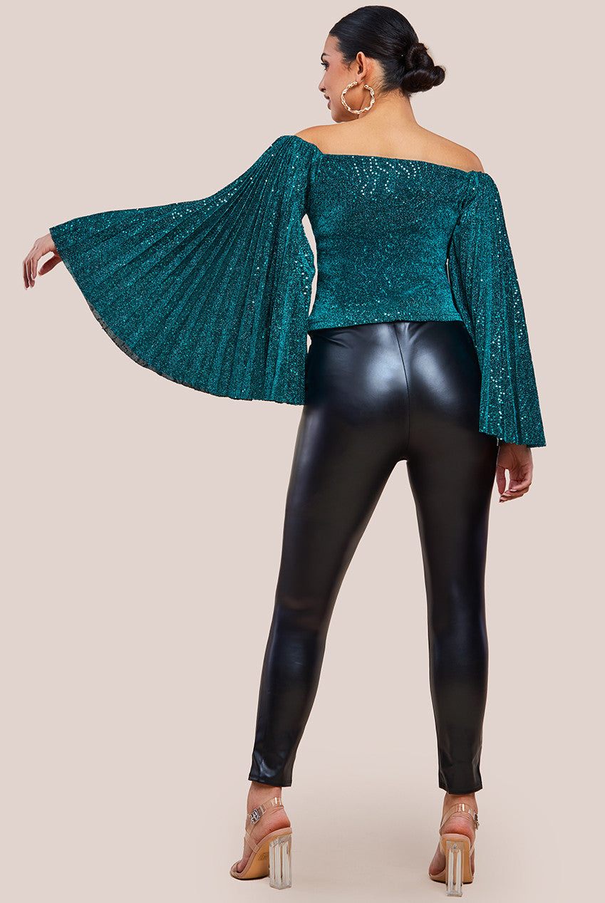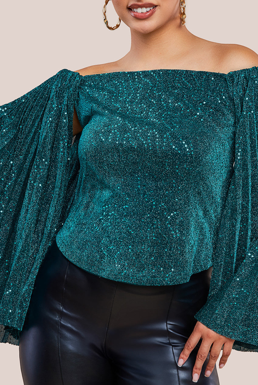 Goddiva Patterned Sequin Lurex Off Shoulder Pleated Flare Sleeve Top